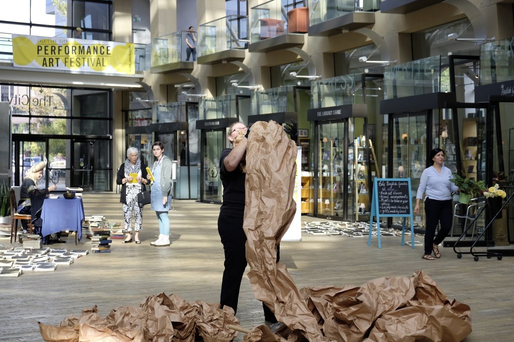 For 30 minutes I crumpled four long rolls of brown paper, and then wrapped them into cocoons and left them on display in the library for the 2-day duration of the festival.