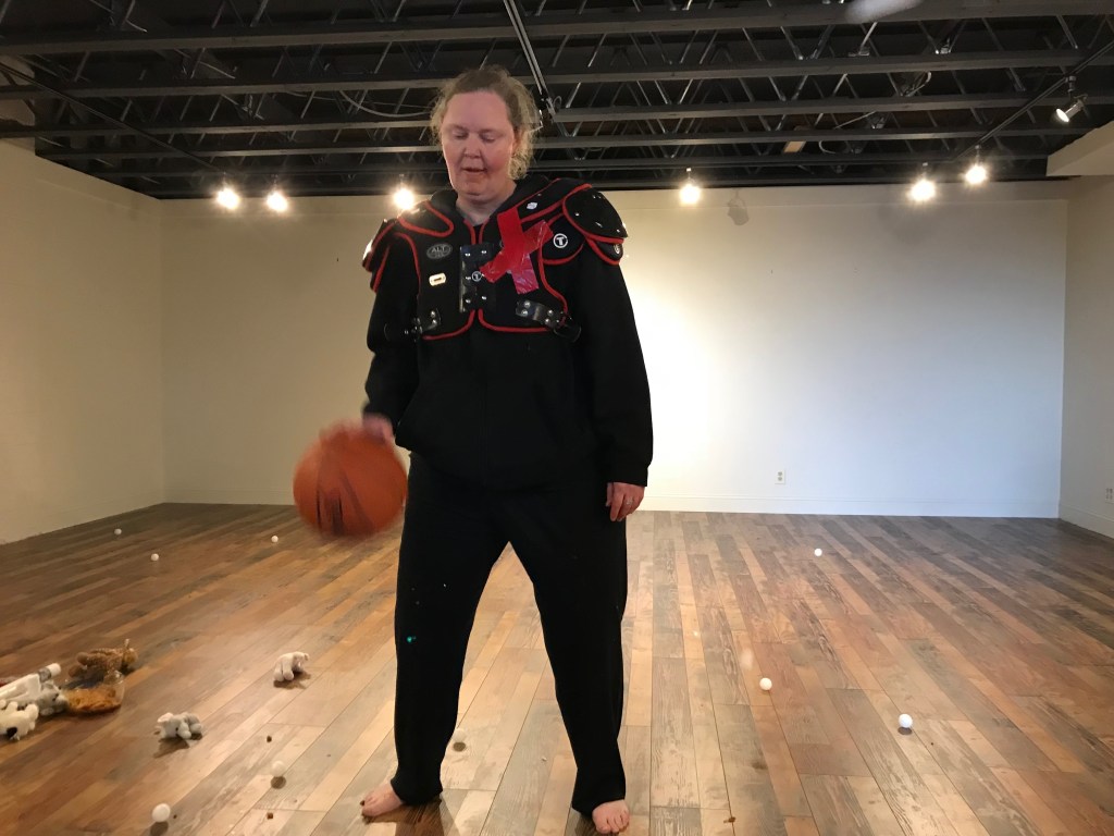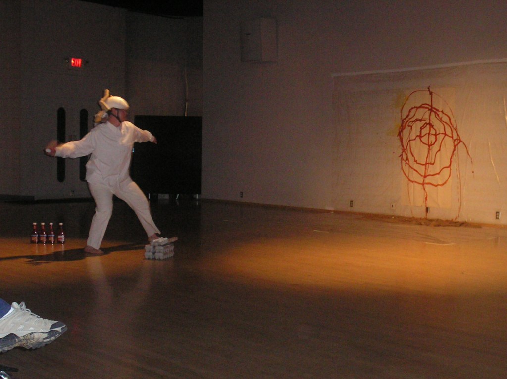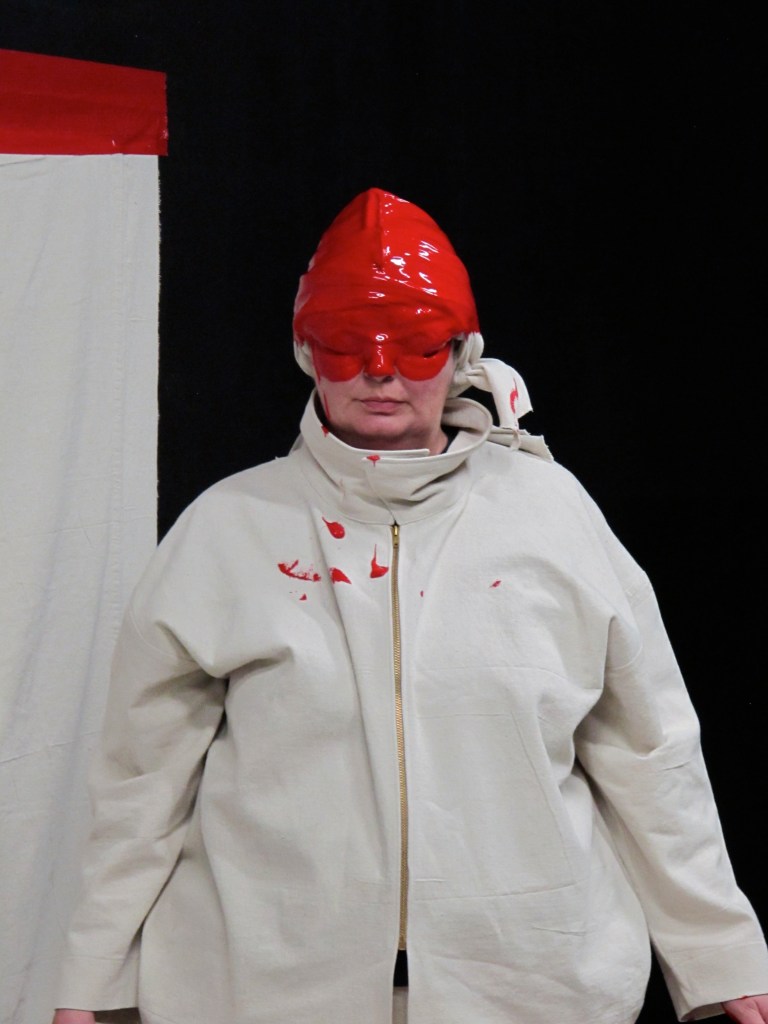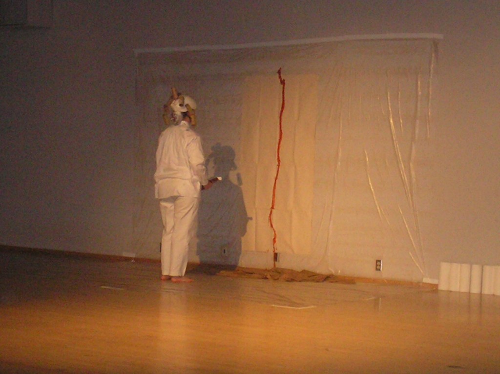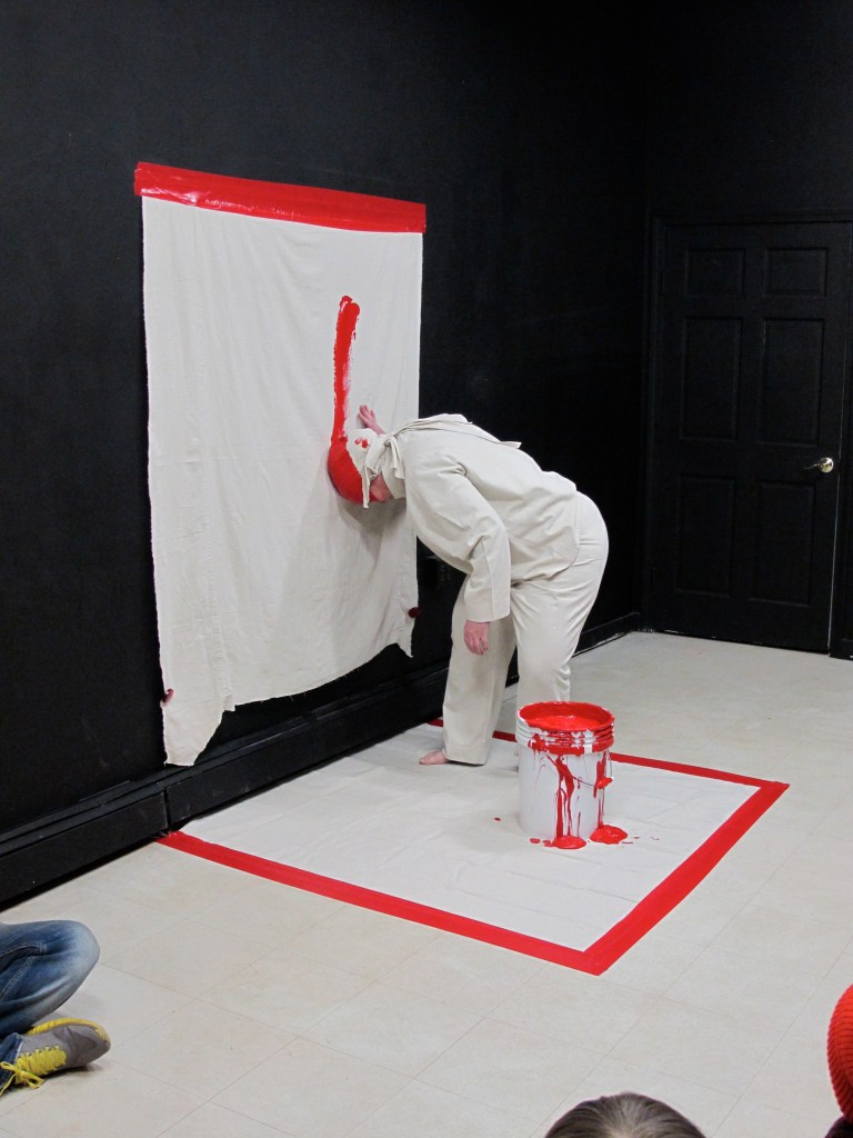 Wearing a canvas suit, I read random notes from my journal, then dunked my head in a bucket of red paint and painted on a piece of canvas taped to the wall.