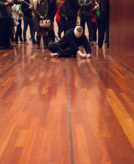 Blindfolded with gauze, I un-taped a line of black tape to the far end of the gallery and then blew up a black balloon until it popped.