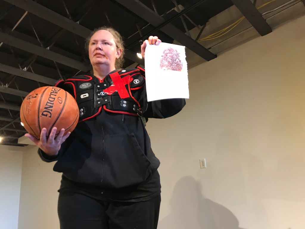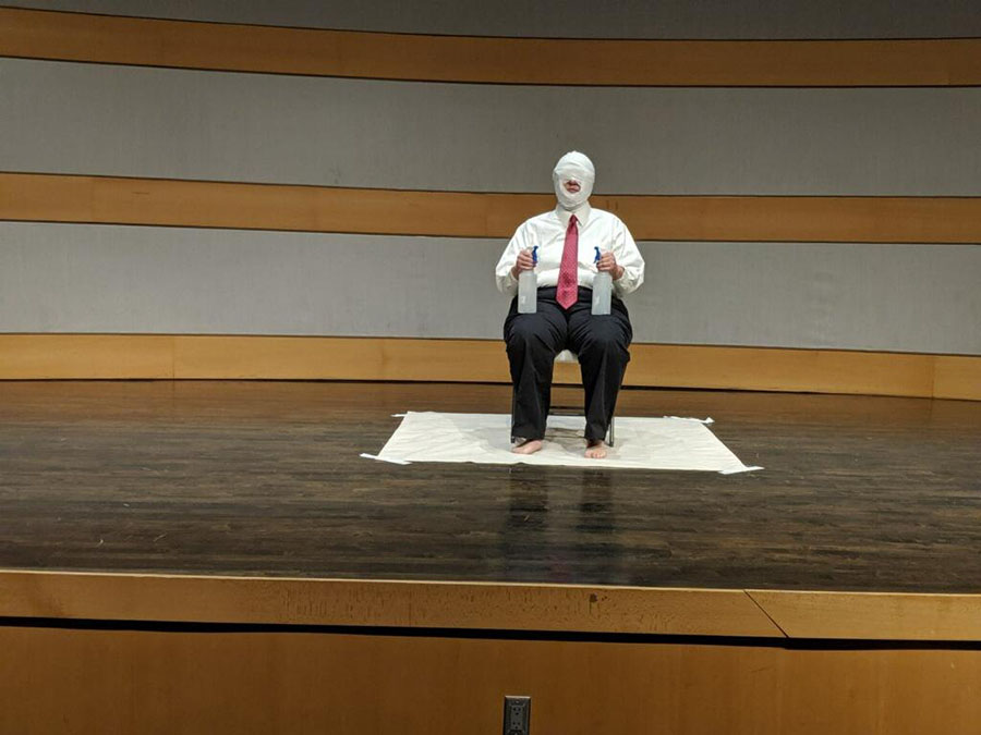 For a performance at Mobius, I gave out Band-aids to my audience members, asking them to place the Band-aids on themselves where they hurt. I then wrapped my head in gauze, fake flowers, and ice cube trays as a way of pointing to mental pain.