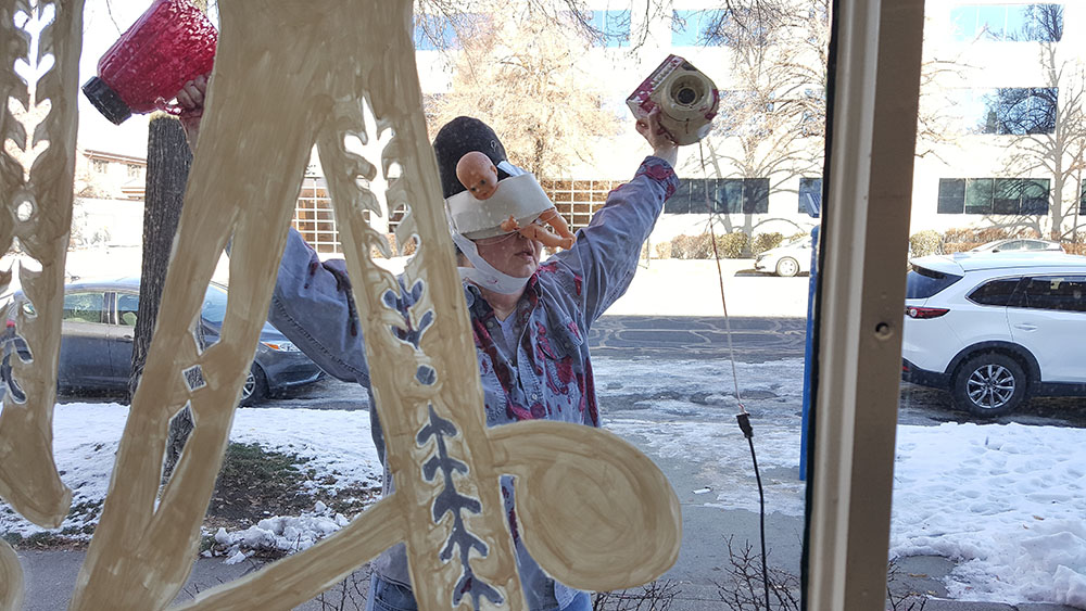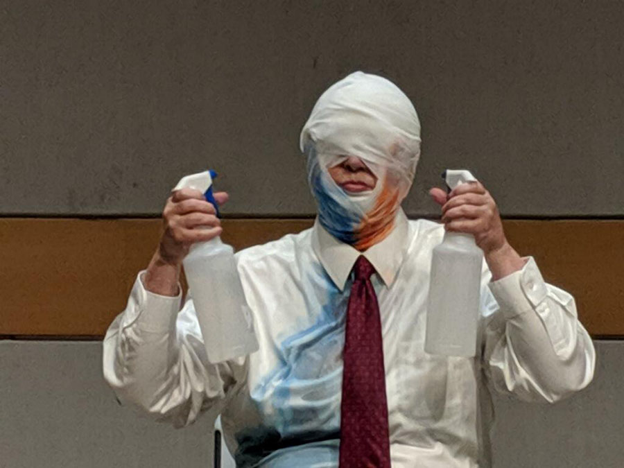 Holding an open blender and my head wrapped in tracing paper with a baby doll within the wrapping, I spun like a whirling dervish, allowing blended beets to spill out of the blender.