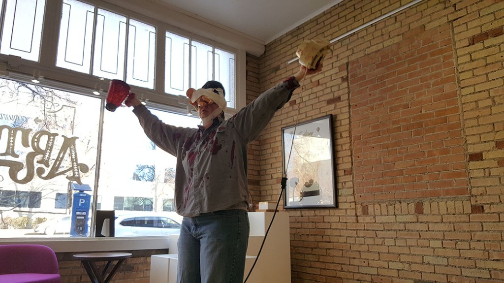In the Great Hall at UMFA, I had paintings I painted of my persona, Clumsy Cakes, on the wall. I performed as Clumsy Cakes, talking to people about why I would make a good president. I served cake.