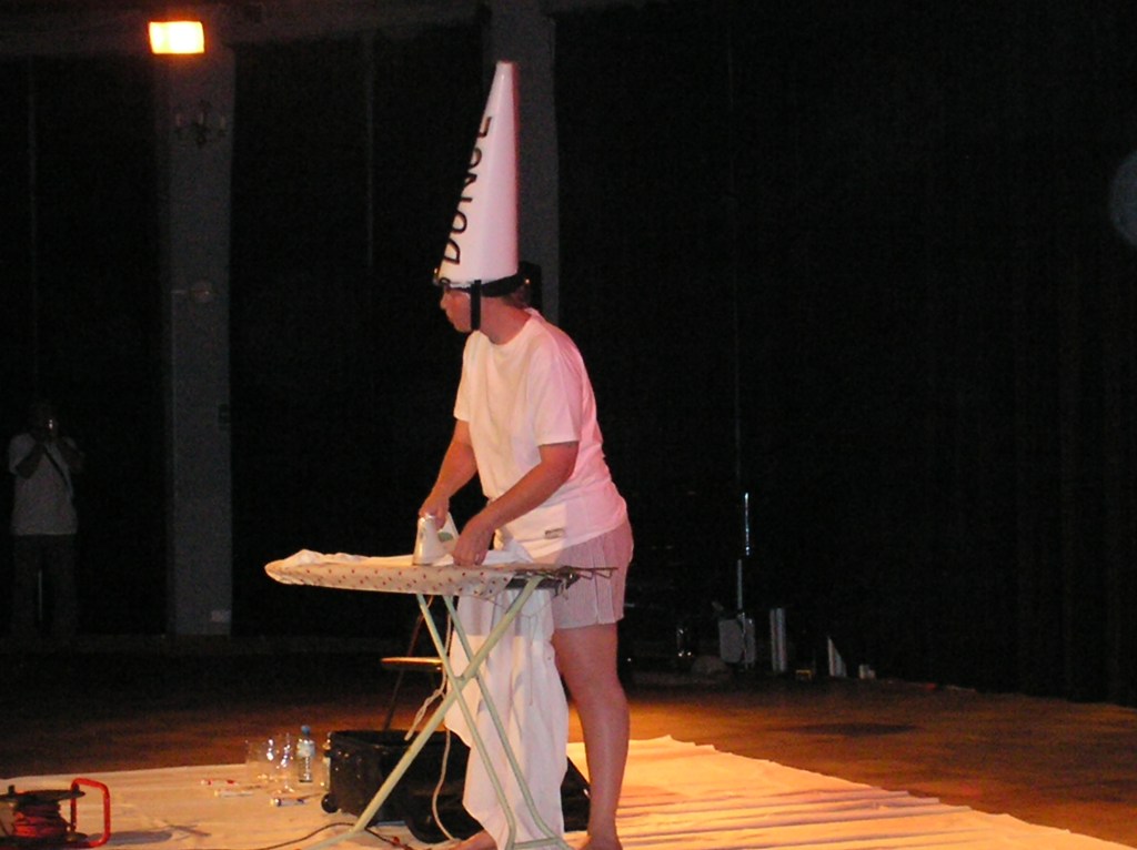 I told stories about my Grandmother while wearing a dunce cap and ironing my clothes. After I had put on my ironed clothes, I sat at a chair and painted the dunce cap while it was on my head to look like a stagnant American flag.