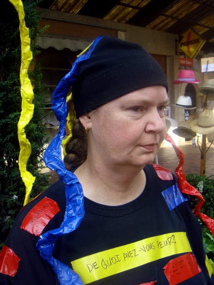 With a sign in French reading, “What do you Fear?”, I asked people to write on tape what they feared and stick it to my body.